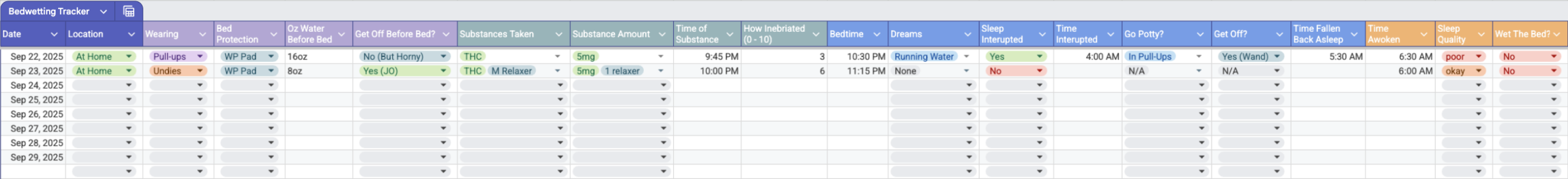 Since indulging in this fixation of mine over the past year and a half, there have been periods where I will spend a week or two putting in a solid effort to setup all the right conditions every night to induce wetting the bed, but then will give up or lose interest for a few weeks, and repeat the cycle. I wanted a way to meticulously track all of the factors that I thought could possibly influence the success of my attempts, and hopefully find patterns of what works and what doesn’t. Things like the amount of water drank or substances taken before bed, whether putting a pad down subconsciously helps, etc. I find this also helps me to stay motivated to keep on trying because I personally love creating and filling out spreadsheets. I have spreadsheets for almost everything! Autism!