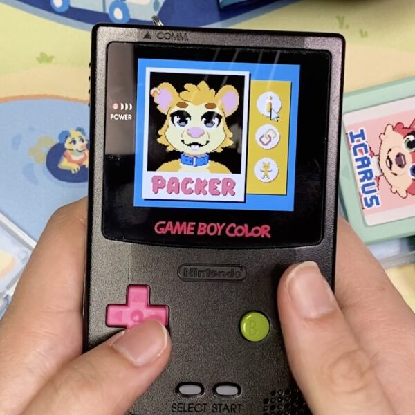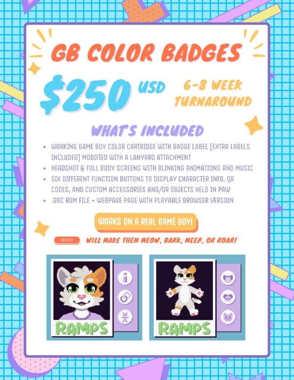 These badges are real cartridges that work on the Game Boy Color (as well as the GBA, or anything else that plays GBC cartridges). Display it on your lanyard with the included attachment, and when the other (less) cool kids gather around to admire it — slot it right into your game boy and it’ll boot up the customized rom! Let their jealousy wash over you.